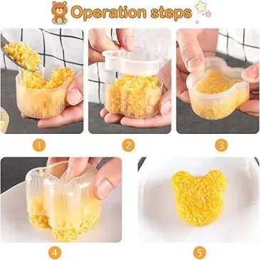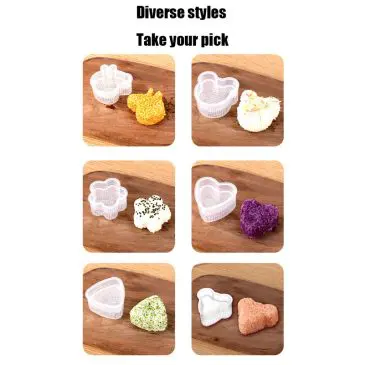 Alat pencetak nasi dilengkapi tutup dengan berbagai bentuk yang berbeda dan unik. Cocok untuk bekal dan memancing selera makan anak. Terbuat dari bahan PP berkualitas, bebas BPA dan aman digunakan. Memiliki permukaan anti lengket mencegah cetakan menempel pada nasi, dan sangat mudah serta menghemat waktu dan tenaga untuk membuat sushi/onigiri. Ukurannya yang tidak terlalu besar sehingga mudah untuk dibawa berkemah, piknik, atau dimanapun Anda mau. Nikmati proses sushi DIY bersama anak-anak, keluarga dan teman Anda.