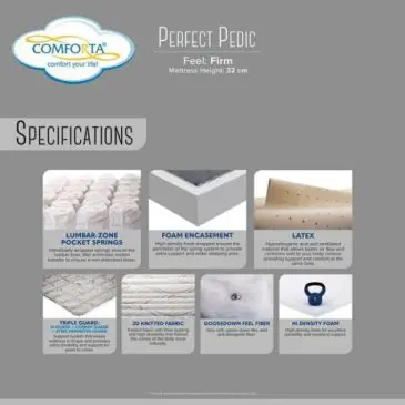 Kasur dengan rangkaian pegas Couple ComfortTM dan dibungkus dengan Foam Encased yang akan membuat tulang punggung terjaga pada saat tidur. Perfect Pedic adalah pilihan tepat bagi anda yang mendambahan tidur berkualitas dan sehat.