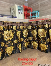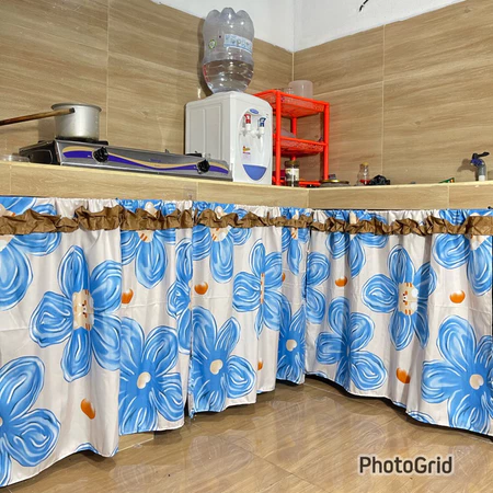 Gorden Penutup Kolong Meja Dapur Bunga Biru Besar 100x70cm
