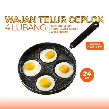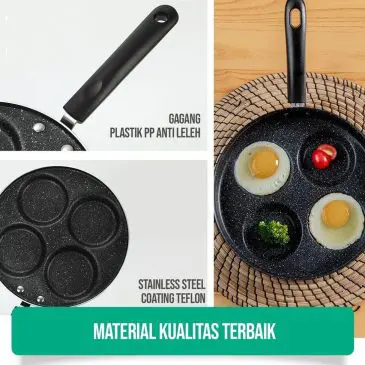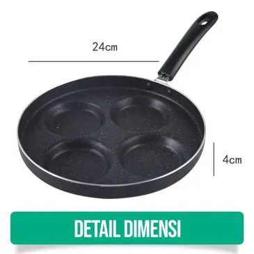 Panci penggorengan 4 lubang ini memudahkan saat memasak telur goreng, memasak jadi lebih cepat dan dapat menghemat waktu. Apalagi saat mempersiapkan sarapan pagi, panci penggorengan ini sangat bermanfaat. Dengan material aluminium sangat aman digunakan se ak akan berkarat. Fitur : 1. Tepat 4 buah lubang untuk menaruh telur. Anda dapat membuat 4 telur omelet dalam waktu bersamaan. 2. Panci ini terbuat dari bahan aluminium dengan coating teflon ani lengket yang tebal dan ak gampang penyot. Bahan stainless steel ini juga memastikan panci ak gampang karatan.