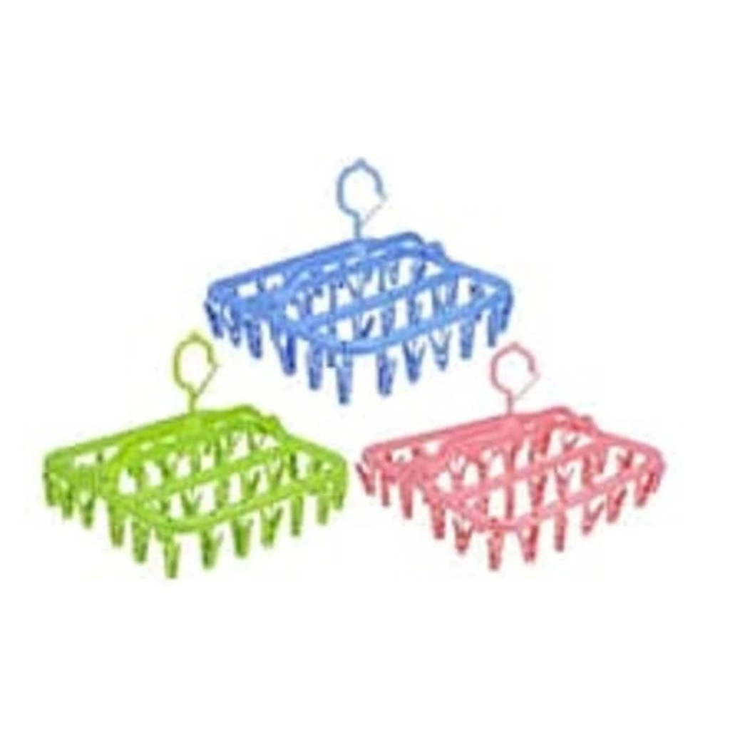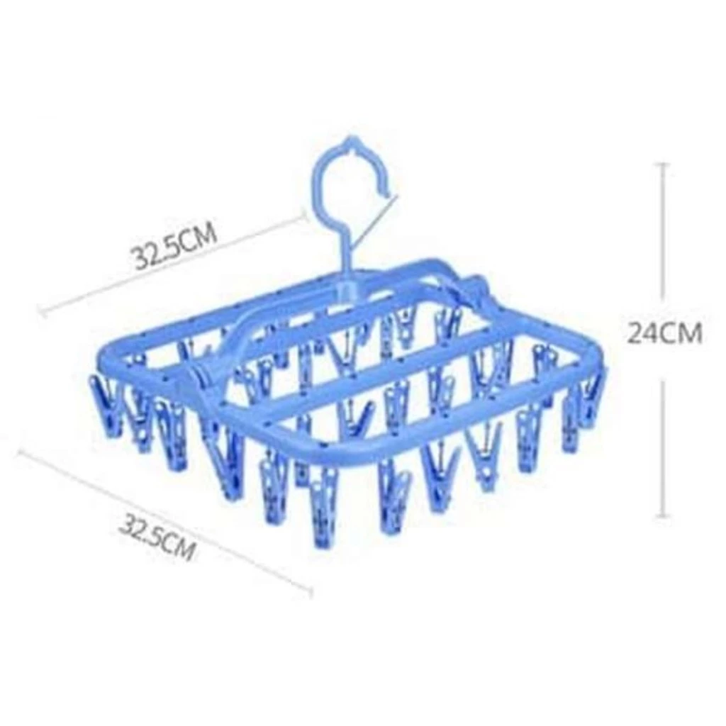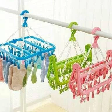 hanger dengan 32 anak jepitan sangat praktis dipakai untuk jemuran kaos kaki, celana dalam, bra, pakaian bayi, sarung tangan. Irit tempat, dengan hanger ini tali atau tiang jemuran bisa gantung lebih banyak pakaian.