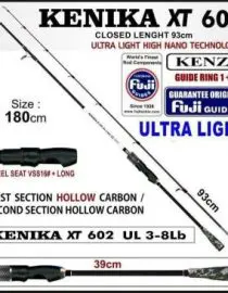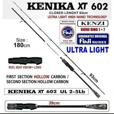Spesifikasi – panjang 180 cm – 2 section – material carbon – line 2 – 5 lb – line 3 – 8 lb – cincin full fuji – action ultra light