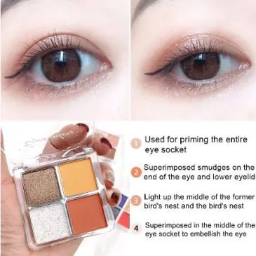 1. Palet eye shadow ini berisi 4 warna eye shadow, memungkinkan Anda dengan mudah membuat berbagai gaya eye shadow, namun tetap mudah di bawa berpergian.