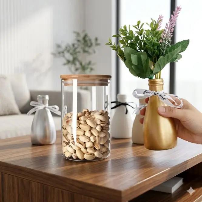 Paket Hemat Toples Kaca Transparan Dengan Tutup Kayu Kedap Udara 900 ML + Vas Bunga Keramik