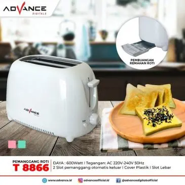 Advance Pemanggang Roti Listrik Toaster Sandwich Otomatis Pop-up T8866 |Garansi Resmi Advance 1 Tahun | Spesifikasi : Tegangan masukan : 220-240 V, 50 Hz Daya : 600 – 700 watt Kabel listrik : Sekitar 75 cm Penutup mesin : Plastik Fitur : 2 slot pemanggang otomatis 1 Fungsi : -Berhenti – Semua tombol dengan lampu pilot – Otomatis mati sendiri – Baki sisa roti bisa dilepas – Penyimpanan kabel – Slot lebar cocok utntuk semua jenis roti – untuk penggunaan harap menyalakan dahulu toaster supaya posisi knop nya terlock jika tidak posisi knop akan balik kembali