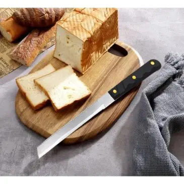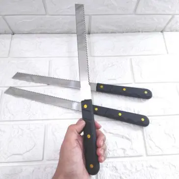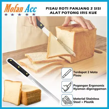 Alat pemotong roti yang terbuat dari stainless steel dan bergagang plastik kuat dan kokoh. Terdapat dua mata pisau. Satu sisi bergerigi sebagai pemotong roti dan satu sisi yang lain bermata tajam (polos) sebagai pemotong cake atau kue. Desain pegangan ergonomis sehingga nyaman digenggam. Mudah dibersihkan.