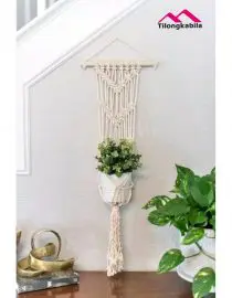 deskripsi produk Macrame ambalan untuk dekorasi rumah. Cocok untuk rak buku atau tempat hiasan-hiasan kecil. – papan menggunakan kayu pinus ukuran 14×35 dan 10*30 – ukuran produk 40×35 – tali menggunakan tali katun warna broken white