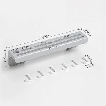 Rak Pisau Gantung dilengkapi 6 Hook, rak ini dilengkapi 3 tempat pisau serta 1 tempat gunting dan tiap Hook bisa digeser – geser sesuai keperluan. Rak ini menggunakan 2 buah Hook dengan double tape untuk memasang rak ke permukaan tembok, pastikan permukaannya halus serta bersih agar bisa menempel dengan lebih sempurna. Hook pada rak ini bisa kamu manfaatkan untuk menggantung berbagai peralatan dapur seperti sikat, lap dapur, alat masak dan peralatan