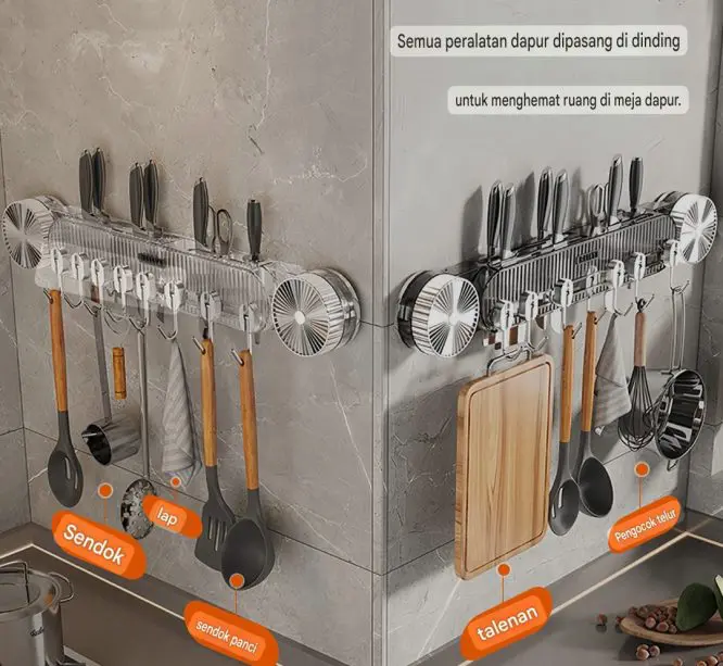 Rak Gantung Pisau Dapur Dengan Perekat Vakum Tanpa Bor – Holder Alat Masak Multifungsi & 5 Kait Gantungan