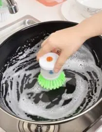 Alat sikat panci inovatif ini dilengkapi dispenser sabun cair. cukup tekan, maka sabun akan keluar otomatis. dengan sikat halus, membantu membersihkan kotoran membandel. jika sikat sudah aus, lepaskan dari tempatnya dan bisa diganti dengan sikat halus yang baru.