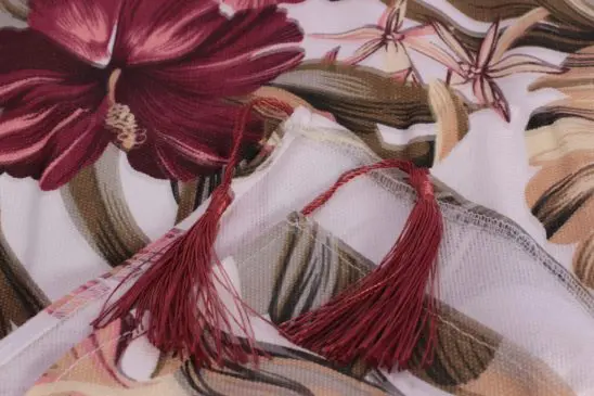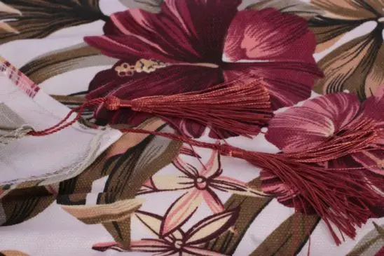 Dipermanis juga dengan tassel kecil di kedua ujung taplak. Taplak meja ini dapat diaplikasikan sebagai taplak meja makan maupun taplak meja tamu yang minimalis.