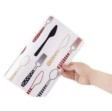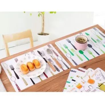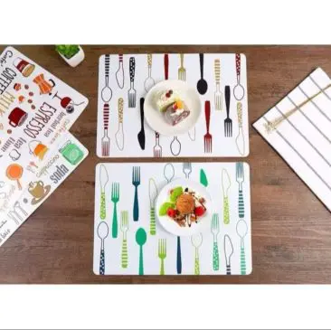 Tatakan anti panas untuk alas piring atau gelas. Cocok untuk pelengkap meja makan. Corak dan kombinasi warna menarik. Ada gambar alat makan dan gelas teko