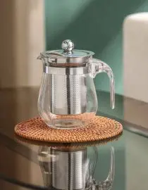 Teko pitcher ini terbuat dari bahan gelas yang tahan panas sehingga tidak perlu takut pecah akibat dituang air bersuhu tinggi.