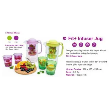 Fit + Infuser waterjug dilengkapi dengan 2 gelas cocok untuk digunakan sehari-hari di rumah.