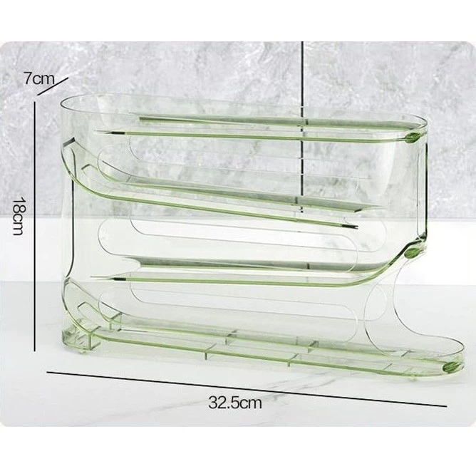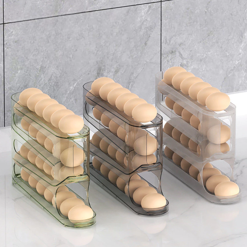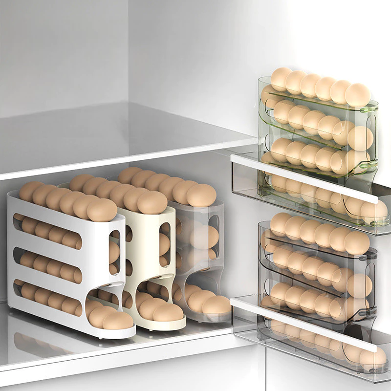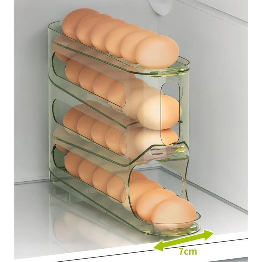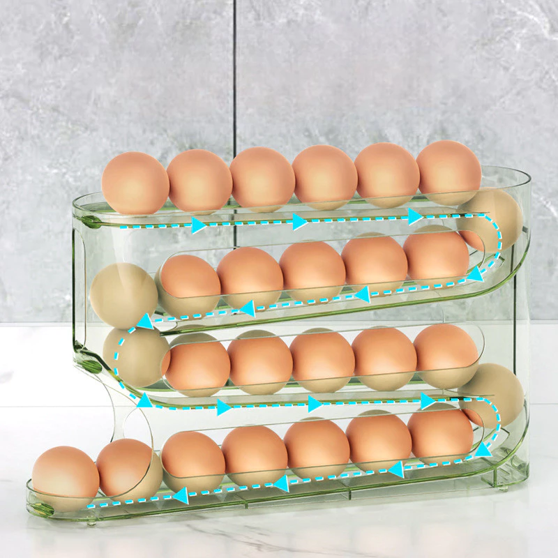 Rak penyimpanan telur dengan desain 4 tingkat. Rak telur ini bisa menampung hingga 30 telur. Desain yang minimalis dan ekonomis, cocok untuk melengkapi perlengkapan dapur Anda. Desain rak telur memiliki kemiringan, membuat telur bergulir otomatis ke bawah saat telur rak bawah di ambil, kini mengambil dan menyimpan telur jadi super mudah.