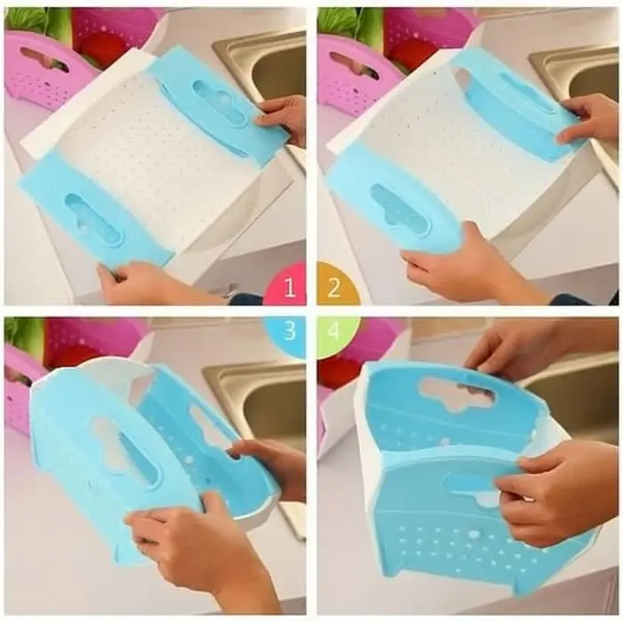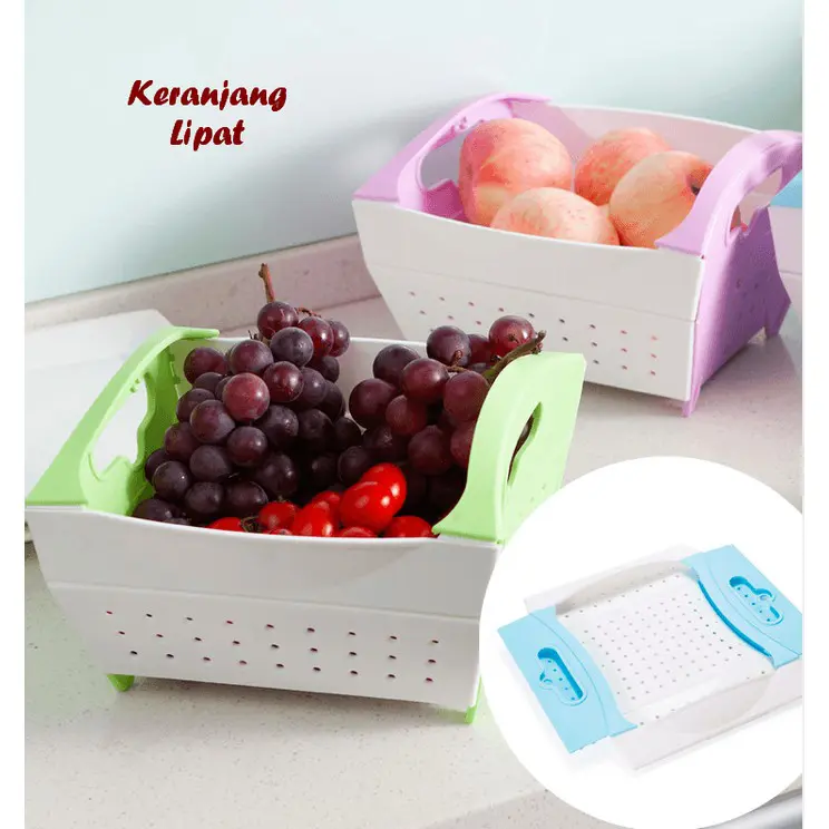 Keranjang unik ini bisa dibuka lipat. Saat dilipat jadi berbentuk keranjang dapur, bisa dipakai untuk tempat buah atau keranjang untuk mencuci dan meniris buah dan sayur.