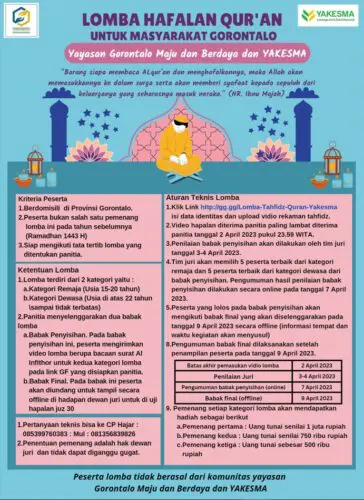 Tilongkabila.com turut mensponsori kegiatan Lomba Hapalan Al Quran yg diselenggarakan oleh Yayasan Gorontalo Maju dan Berdaya serta Yakesma Gorontalo. Final tgl 7 – 9 April 2023.